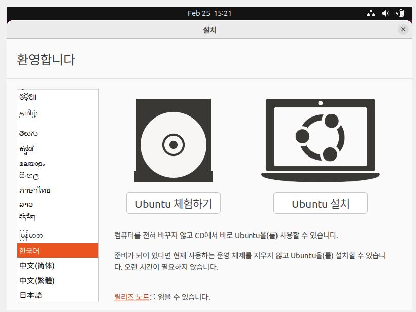 1) [한국어] 클릭 - [Ubuntu] 설치 클릭