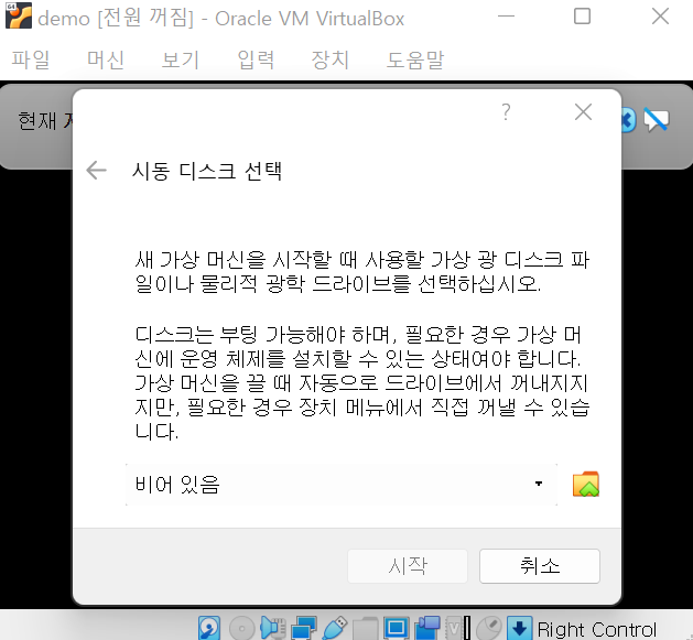 여기까지 가상 머신을 생성하였습니다. 이제 상단의 [시작] 버튼을 눌러 가상 머신을 실행해보겠습니다.