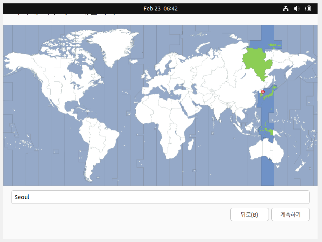 설치 후에, 타임을 맞추기 위해 지역 선택하는 화면이 나옵니다. Seoul 그대로 계속 진행합니다.