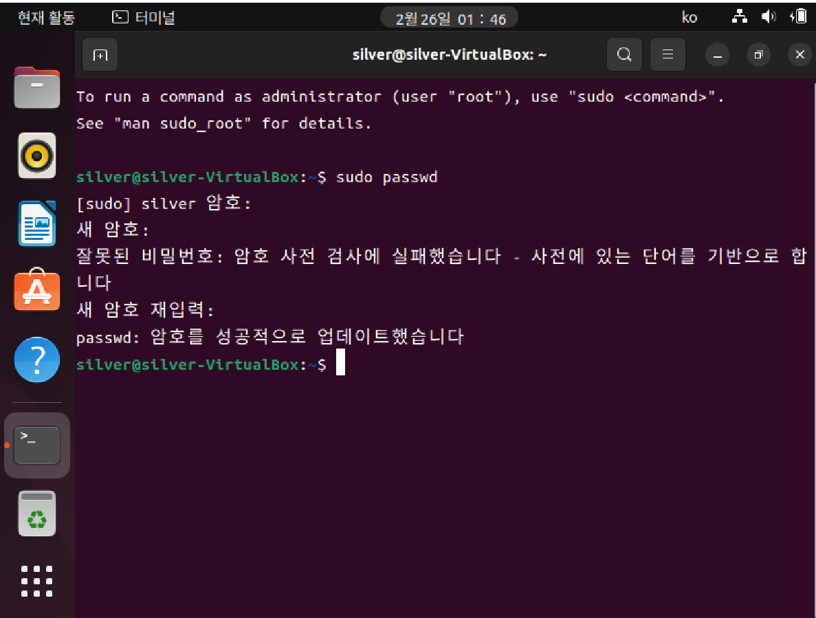 Ctrl + Alt + T 을 사용하여 터미널을 열어줍니다. 그 다음 sudo passwd 명령어를 작성하여 root password를 설정해줍니다.